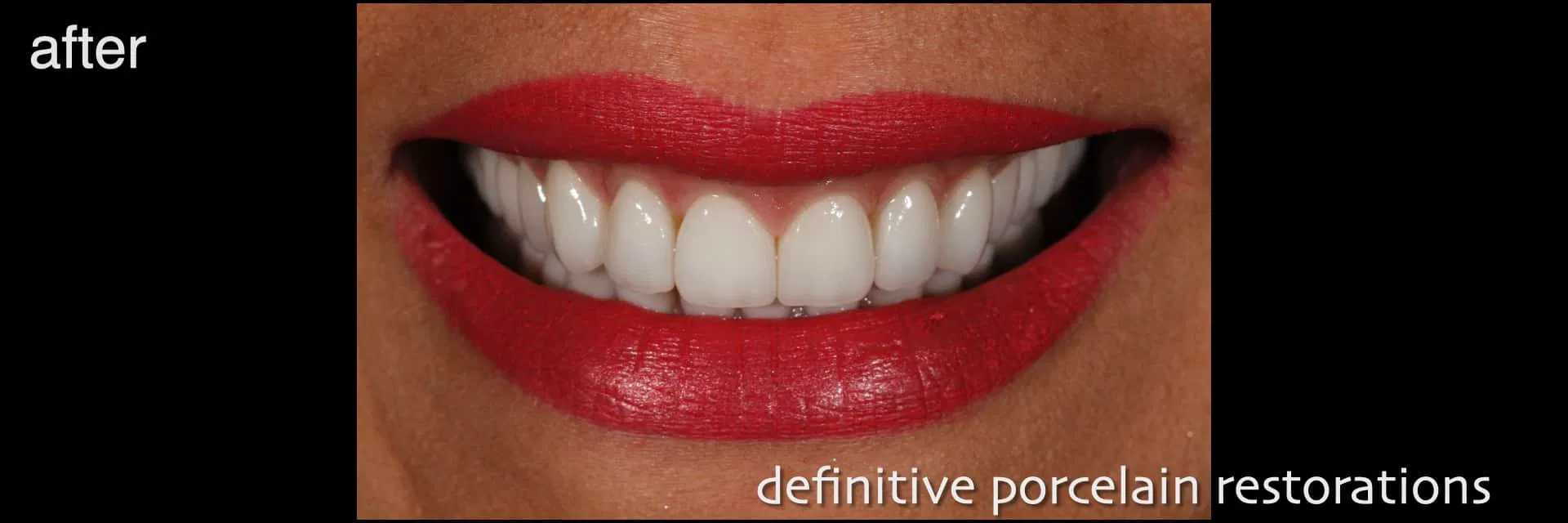 Conservative full mouth restoration/rehabilitation of the severely worn dentition, with bonded partial anterior (conservative porcelain laminate veneer therapy) and partial (posterior conservative porcelain 3/4 onlays) and/or full coverage (conservative 360 degree porcelain and full coverage porcelain restorations) posterior all ceramic restorations.