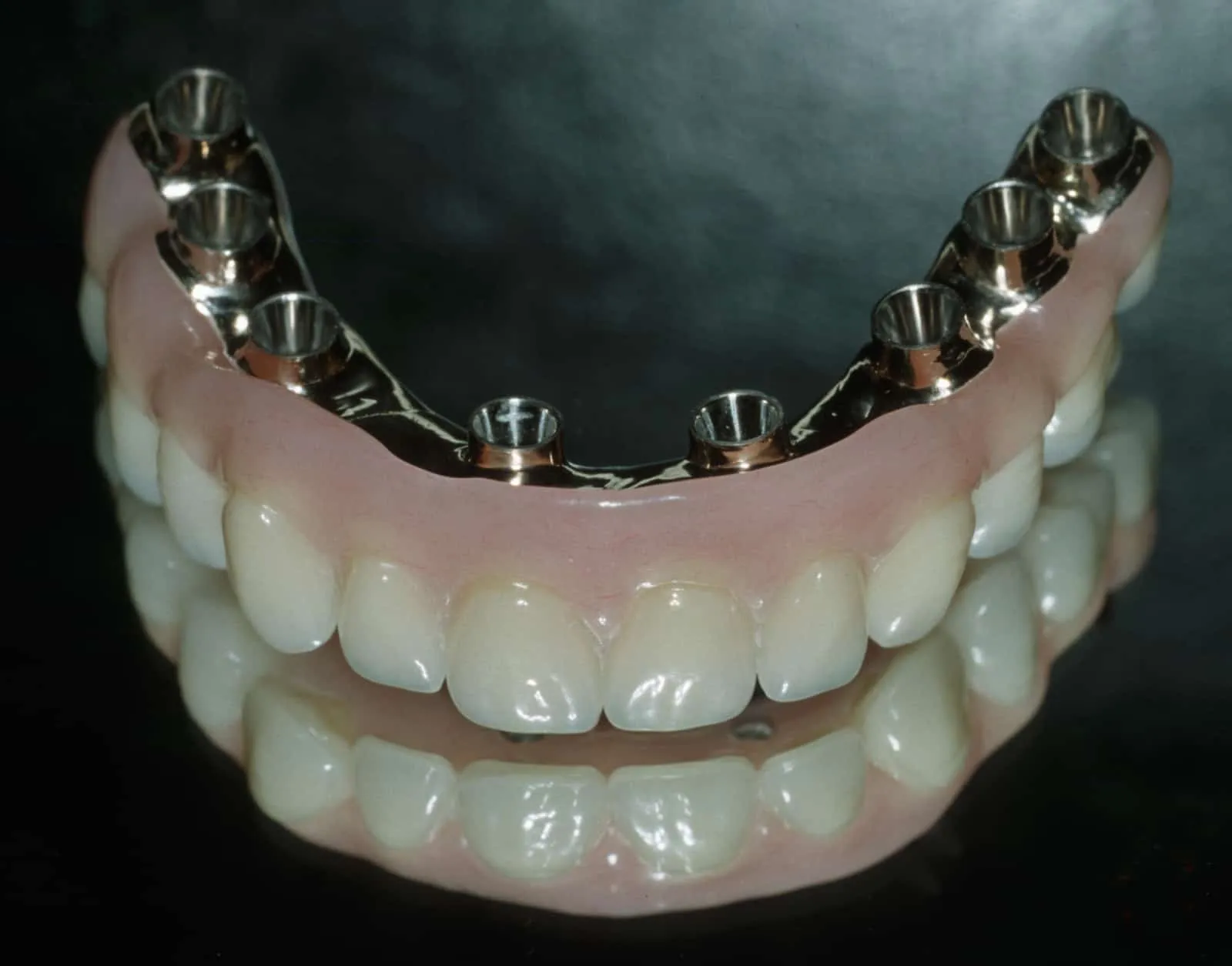 Prior to delivery:Â Completed acrylic fused to gold implant bridge (shown on a mirror against black background), to be fastened permanently to dental implants.