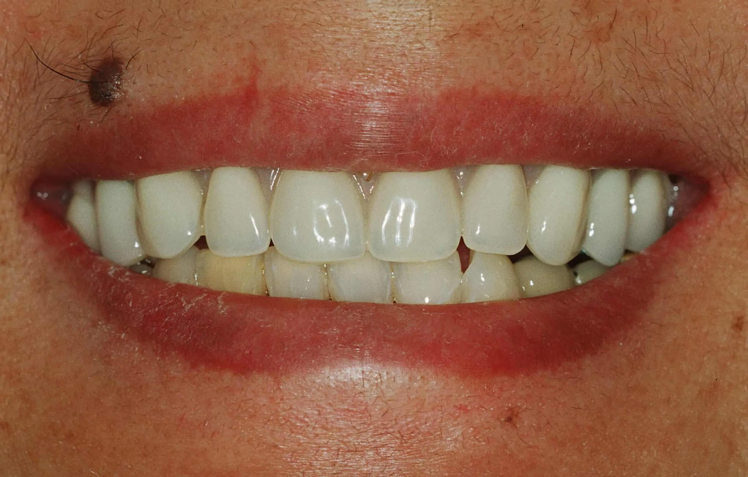 After:Â Completed treatment, following bone grafting, placement of eight implants and delivery of a definitive implant supported bridge (acrylic fused to metal screw-retained design)