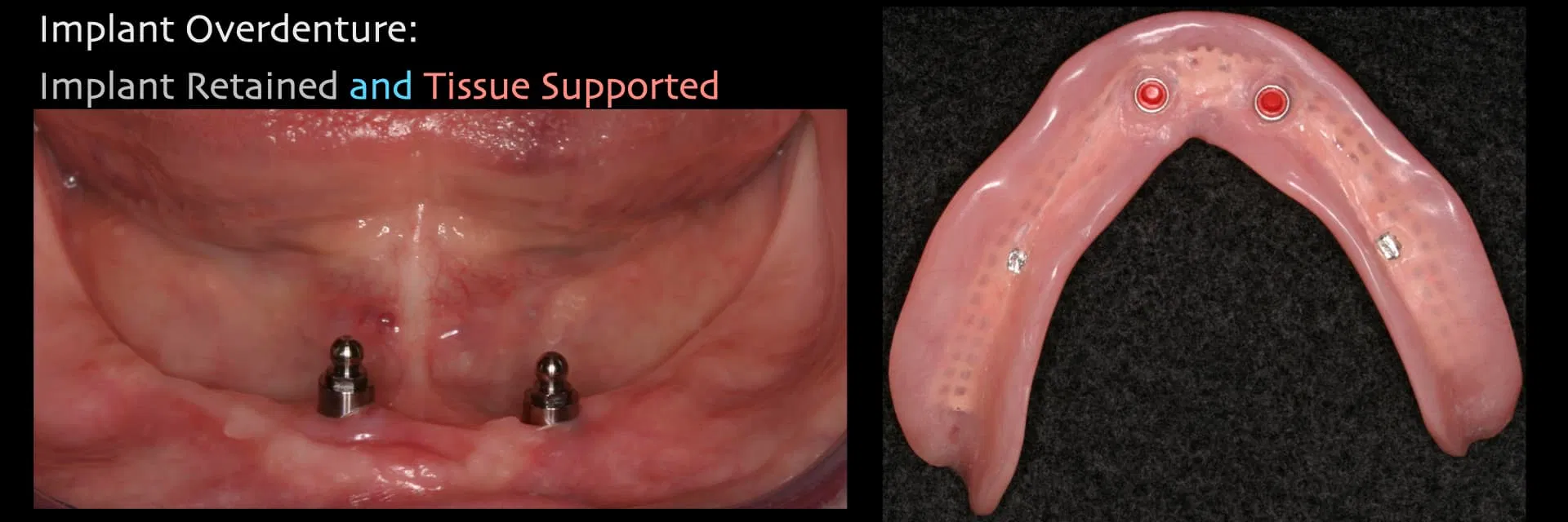 Maintenance: The overdenture has resilient clips inside. These clips wear and are to be replaced every 6 to 12 months. Stress-broken designs continue to be supported by the tissues. Consequently, bone continues to melt away over time behind the implants. As bone melts away, the overdenture procedure will no longer adapt/fit the tissues. Consequently, laboratory relines with new intraoral clip housing pick-up and attachments is required every 2 to 3 years. Plastic denture teeth will wear and new dental prosthetic will be required every 8 to 10 years, depending on the rate of wear. To avoid/minimize bone loss, multiple implants with a rigid-design prosthesis is required.