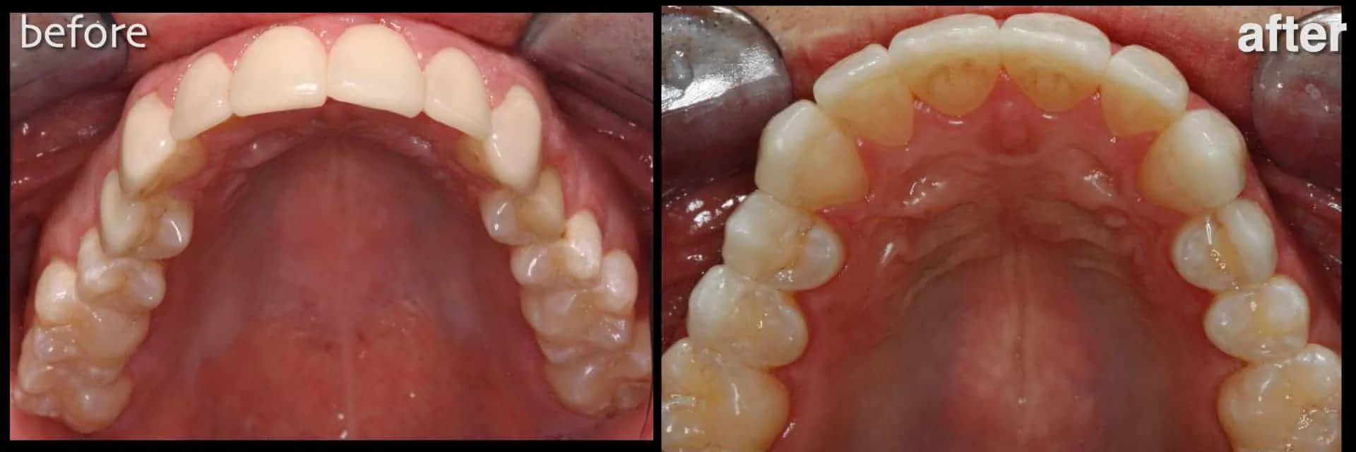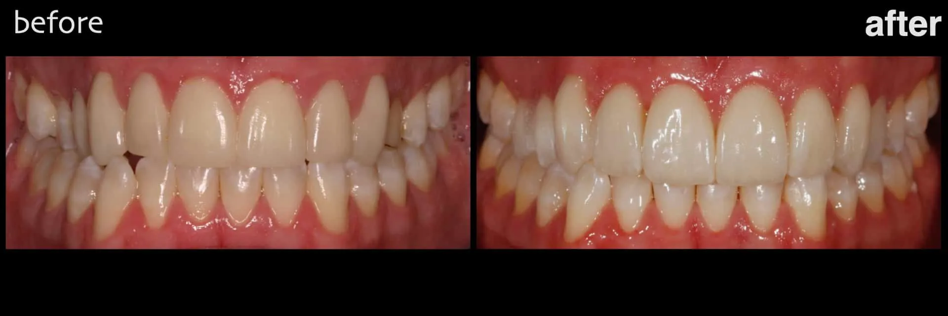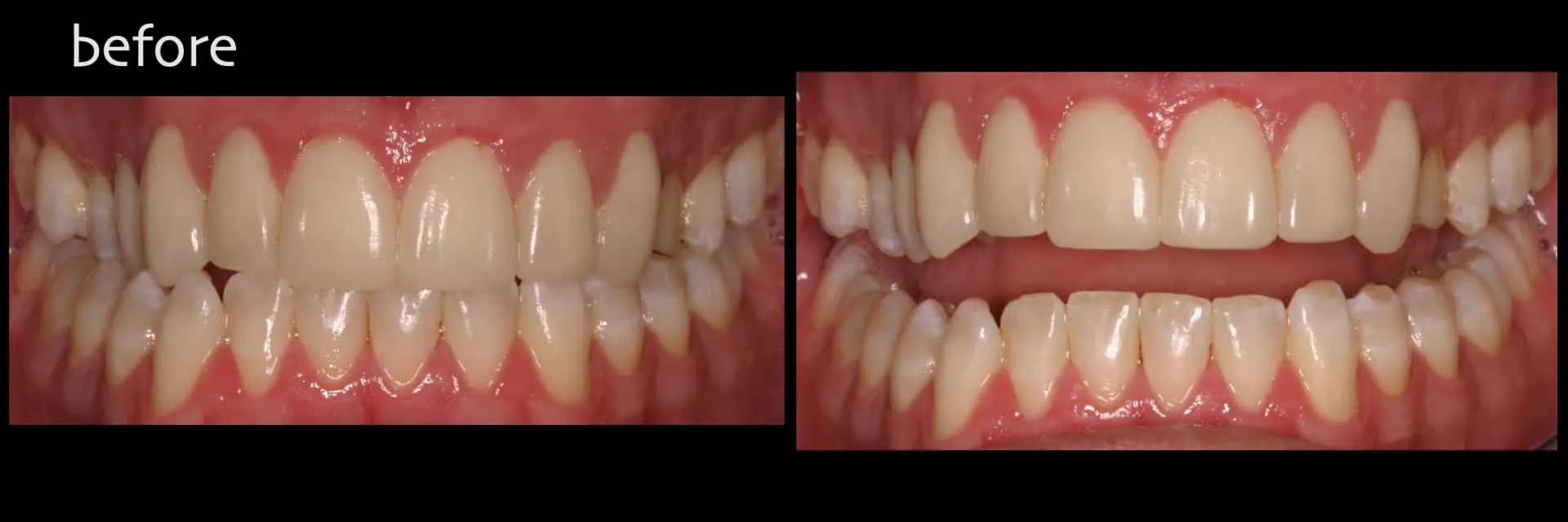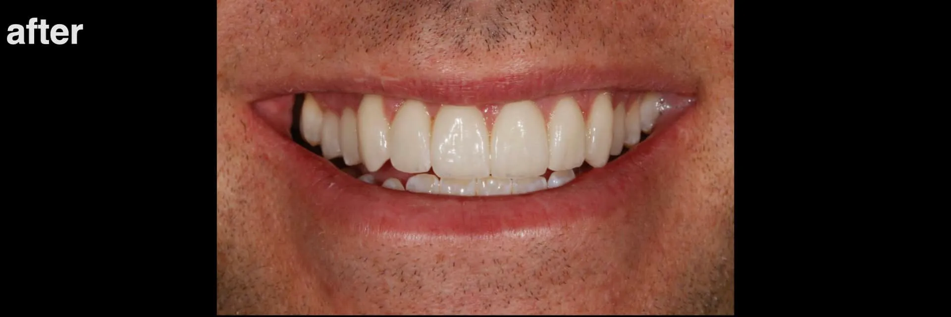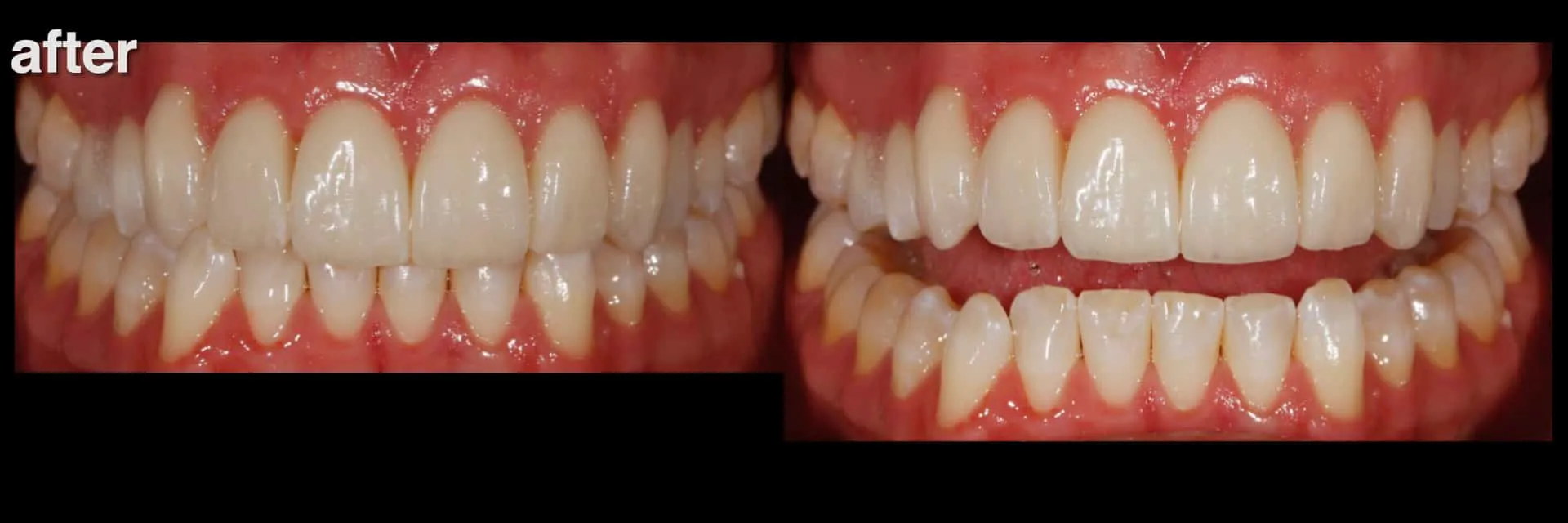 Outcome: Enhanced occlusion/bite and aesthetics. Aesthetics also enhanced with conservative additional porcelain laminate veneers for teeth 4 and 5 (upper right premolars).