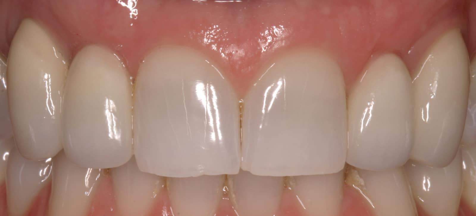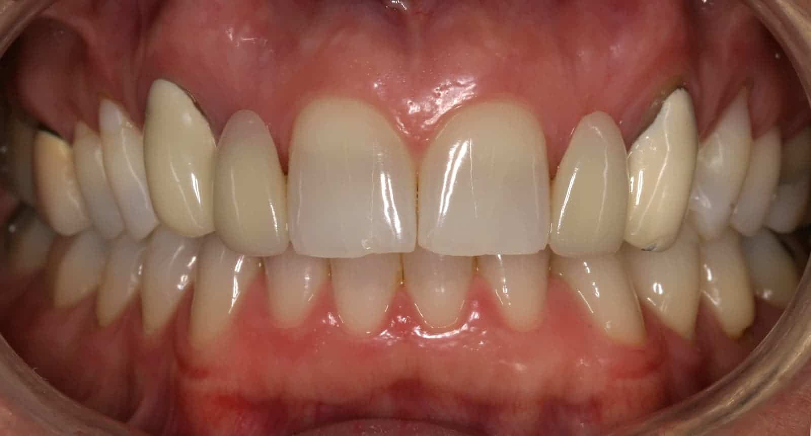 After: Treatment involved tissue augmentation (connective tissue grafts) at pontic sites (false tooth sites) 7 and 10, long-term prototype bridges (temporary bridges), ovate pontic form development, then definitive porcelain fused to gold two-unit bridges (fixed partial dentures), with abutment (support) teeth 6 and 11 (upper canines) and pontics 7 and 10.