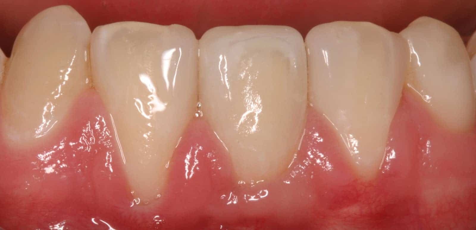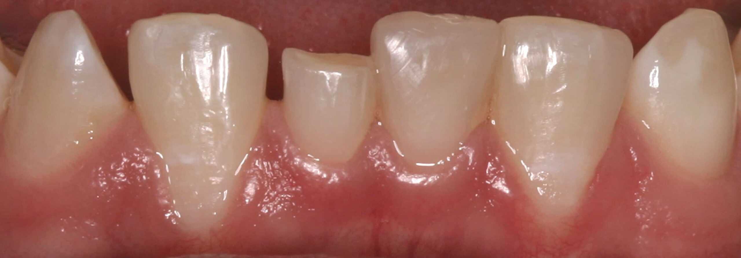 Function and aesthetics were returned following removal of retained deciduous (baby) central incisors, orthodontic therapy to reduce gap size, and single implant placement and restoration to replace congenitally missing lower central incisors. The adjacent lower lateral incisors had bonding procedures performed with composite resin to augment tooth width and overall shape/size, thereby providing even width/harmonious lower anterior front teeth.