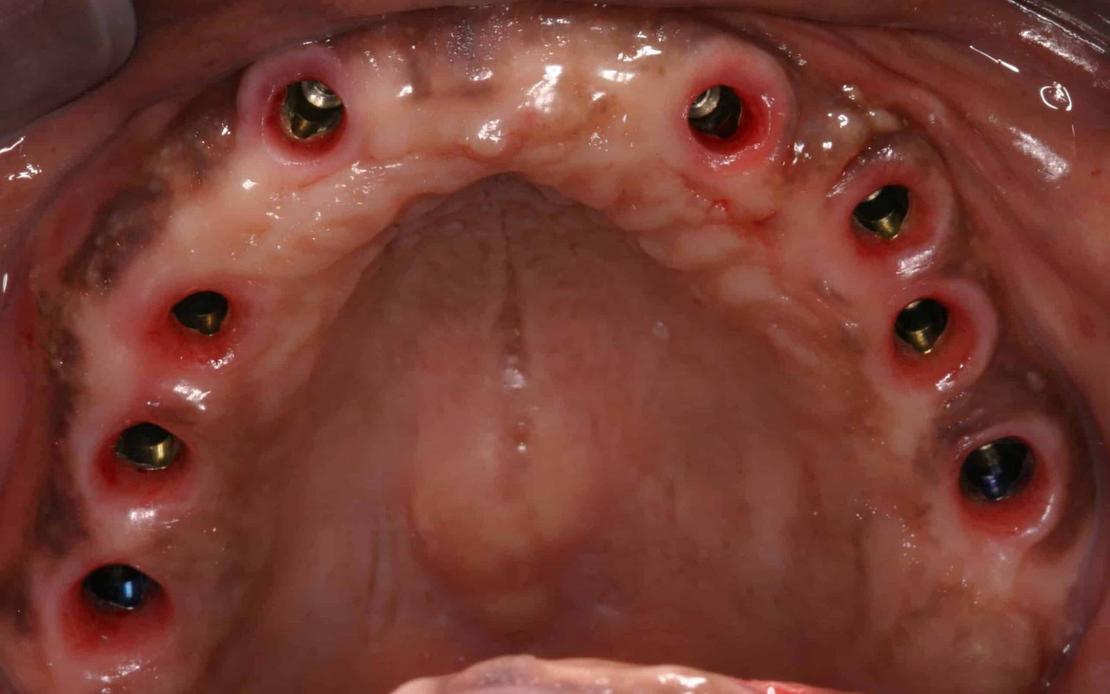 Before: All maxillary (upper) teeth are missing and patient was unsatisfied with her complete denture. She desired a solution that would provide her with an open palate and rigid/stable prosthesis. Treatment involved bone grafting of the upper jaw to allow for implant therapy; 6 months healing; placement of 8 root-form dental implants utilizing a surgical guide; 6 months additional healing (osseointegration).