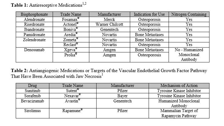 Medication-Related Osteonecrosis of the Jaw The American College of Prosthodontists agrees with the recommendation for the term, “Medication Related Osteonecrosis of the Jaw (MRONJ)” suggested by the American Association of Maxillofacial Surgeons (AAOMS) to replace the previous, more-specific term, “Bisphosphonate-Related Osteonecrosis of the Jaw (BRONJ),” due to the increasing number of osteonecrosis cases resulting from the use of other antiresorptive and antiangiogenic therapies. For a comprehensive review of the pathophysiology, differential diagnosis, incidence, staging, and surgical management of MRONJ several references are suggested for review, but this topic is considered outside the scope of this position statement.1-3 The purposes of this position statement are threefold: